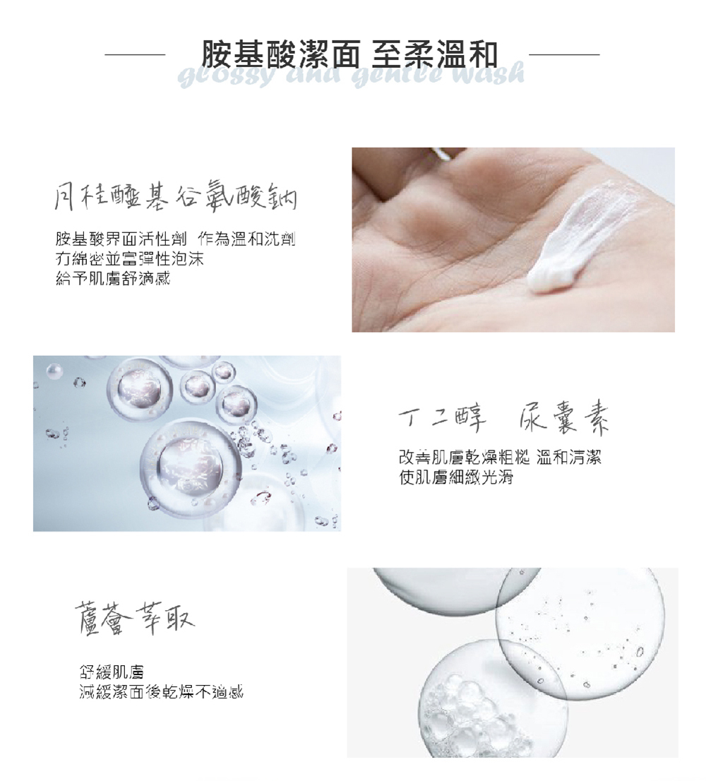 溫和洗淨、清潔肌膚、洗後肌膚柔嫩
