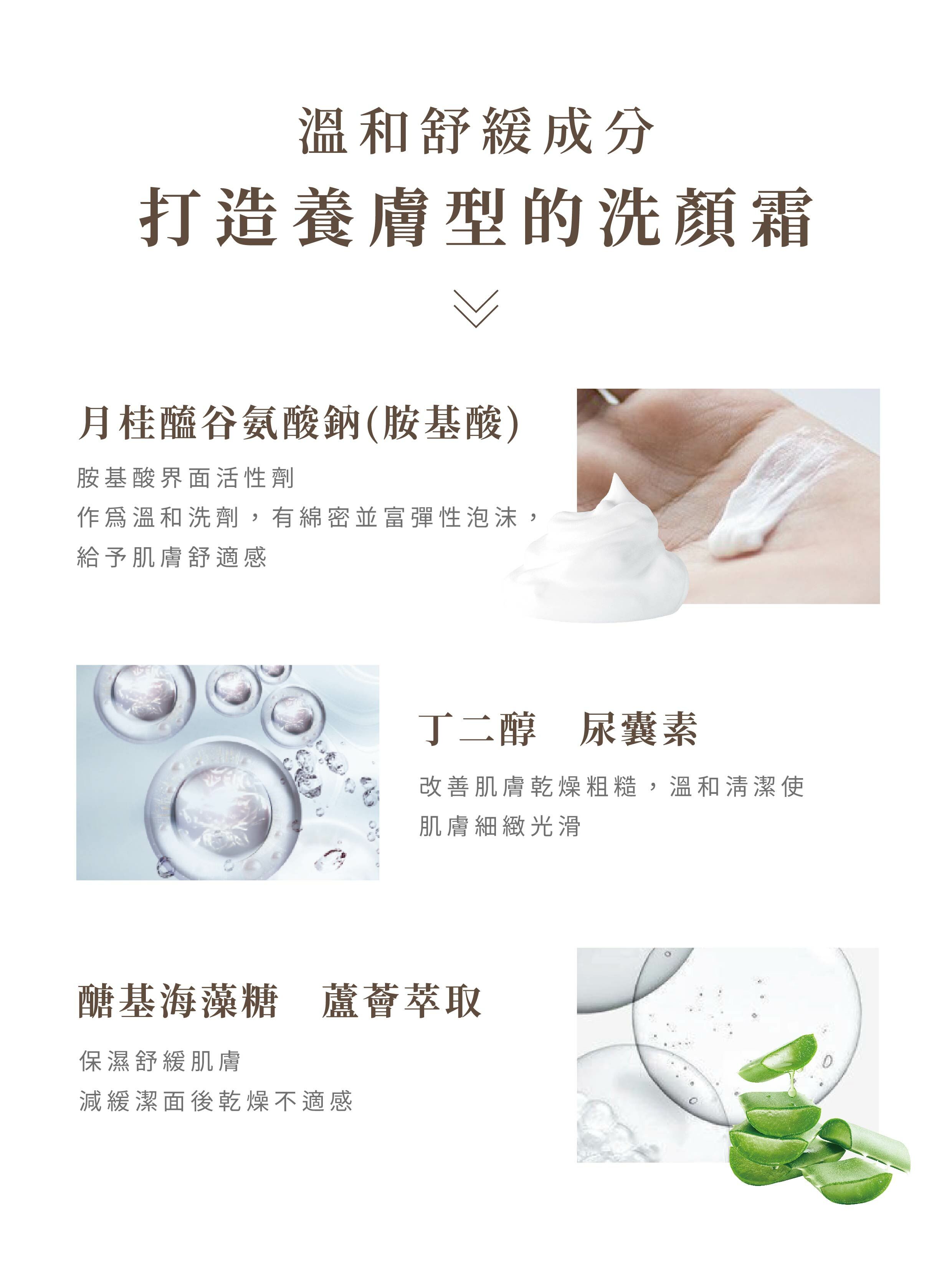月桂醯谷氨酸鈉(胺基酸)、丁二醇、醣基海藻醣、尿囊素、蘆薈萃取