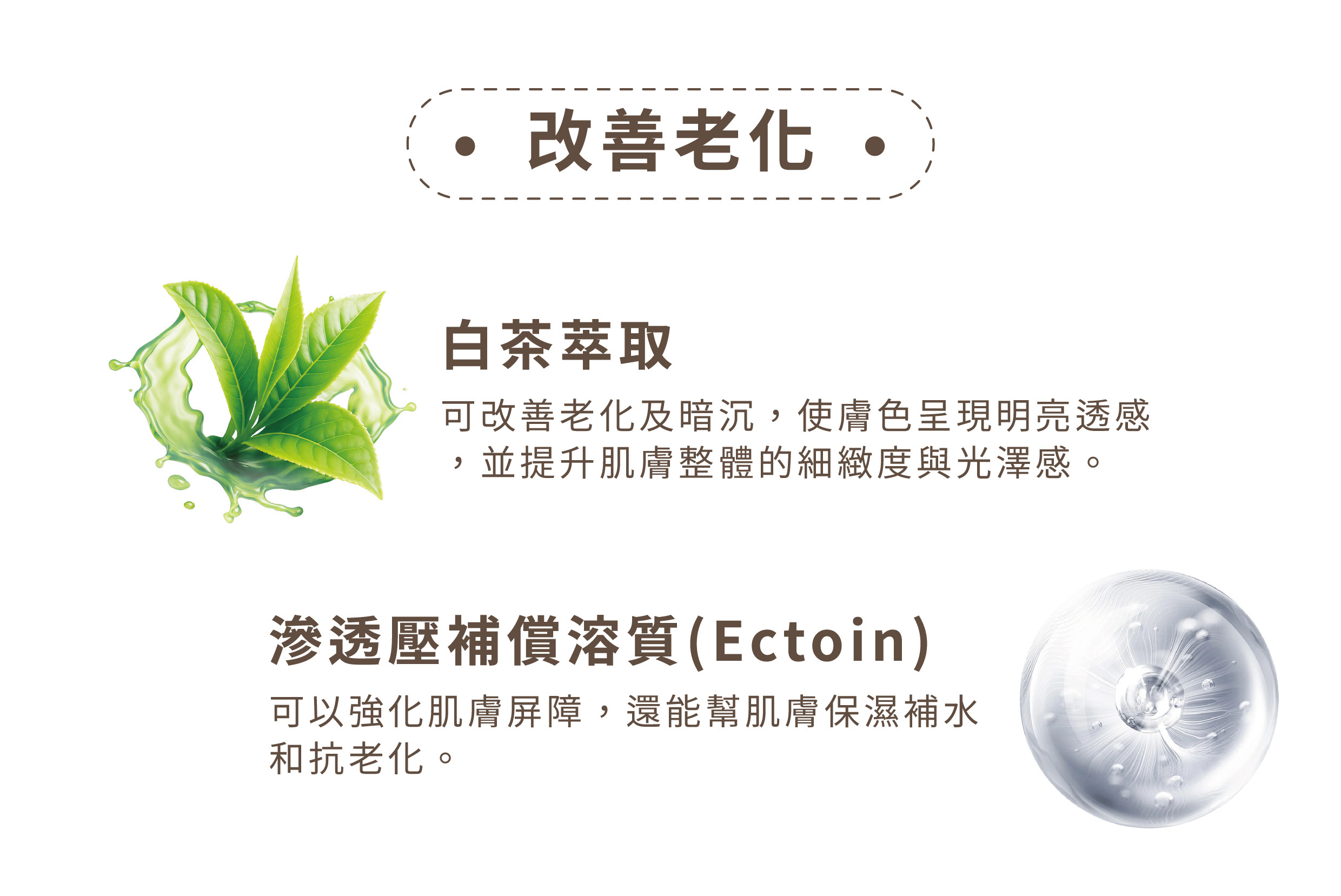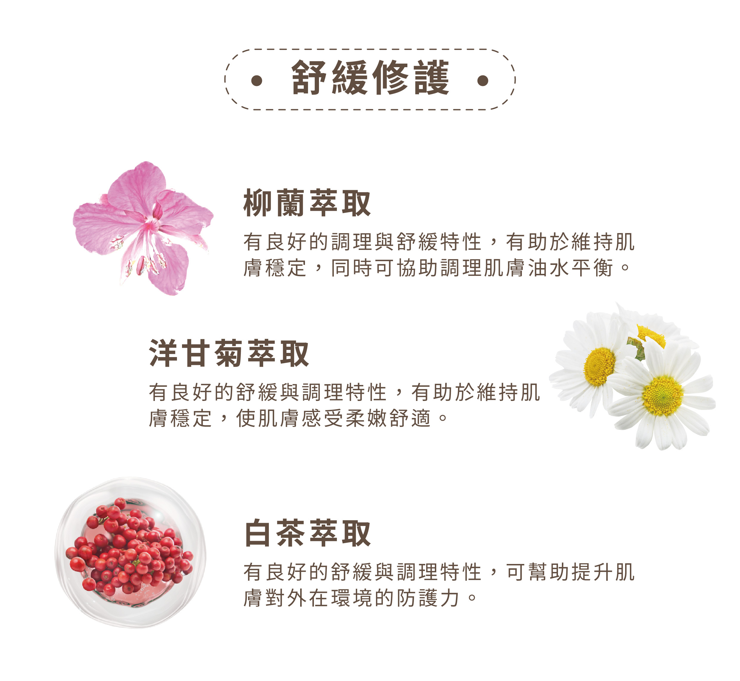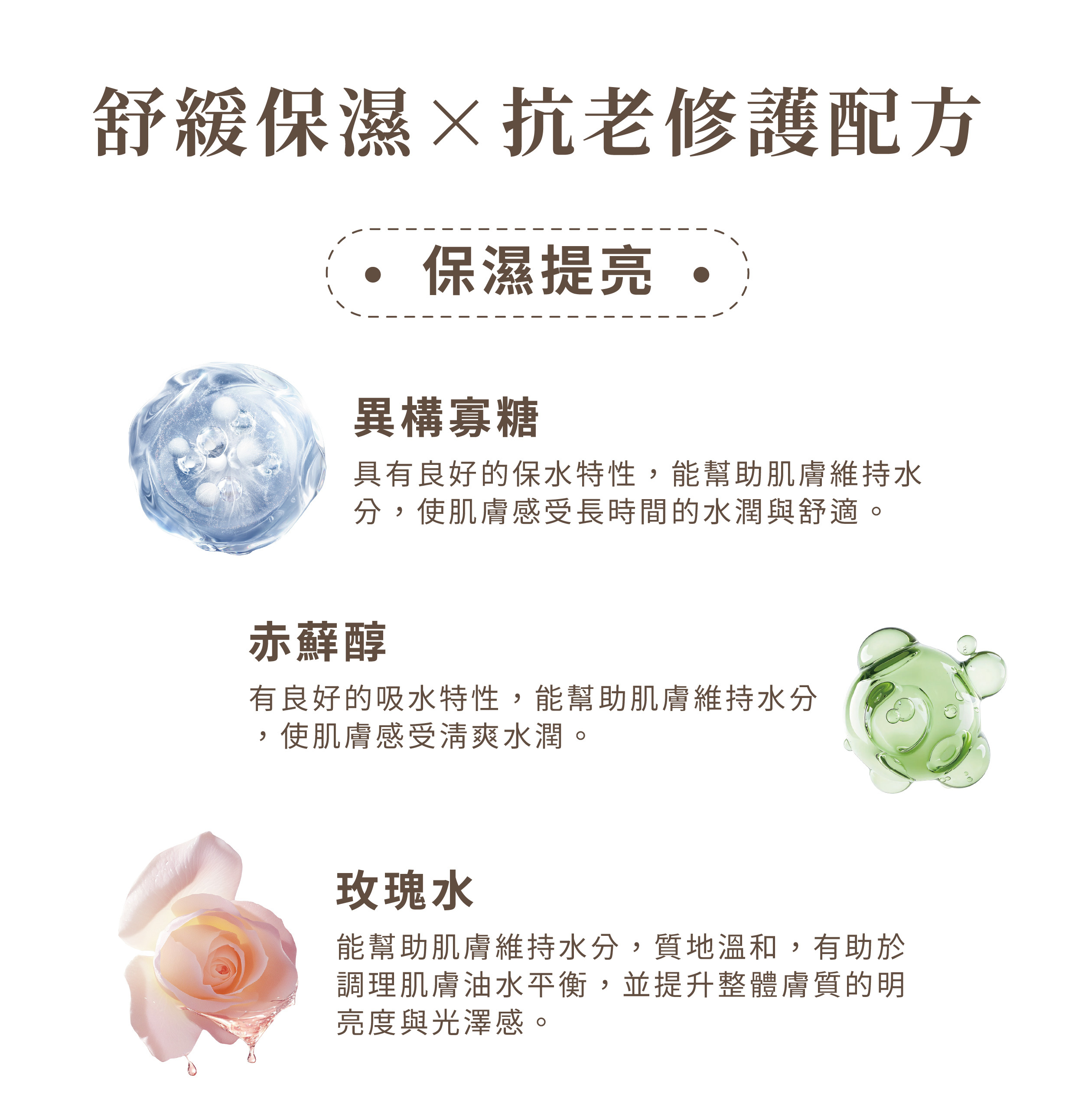 修護、舒緩、滋潤肌膚延緩肌膚老化,提升肌膚保護力,讓肌膚免於各種外來物質的傷害,改善膚質使肌膚更透亮有活力。