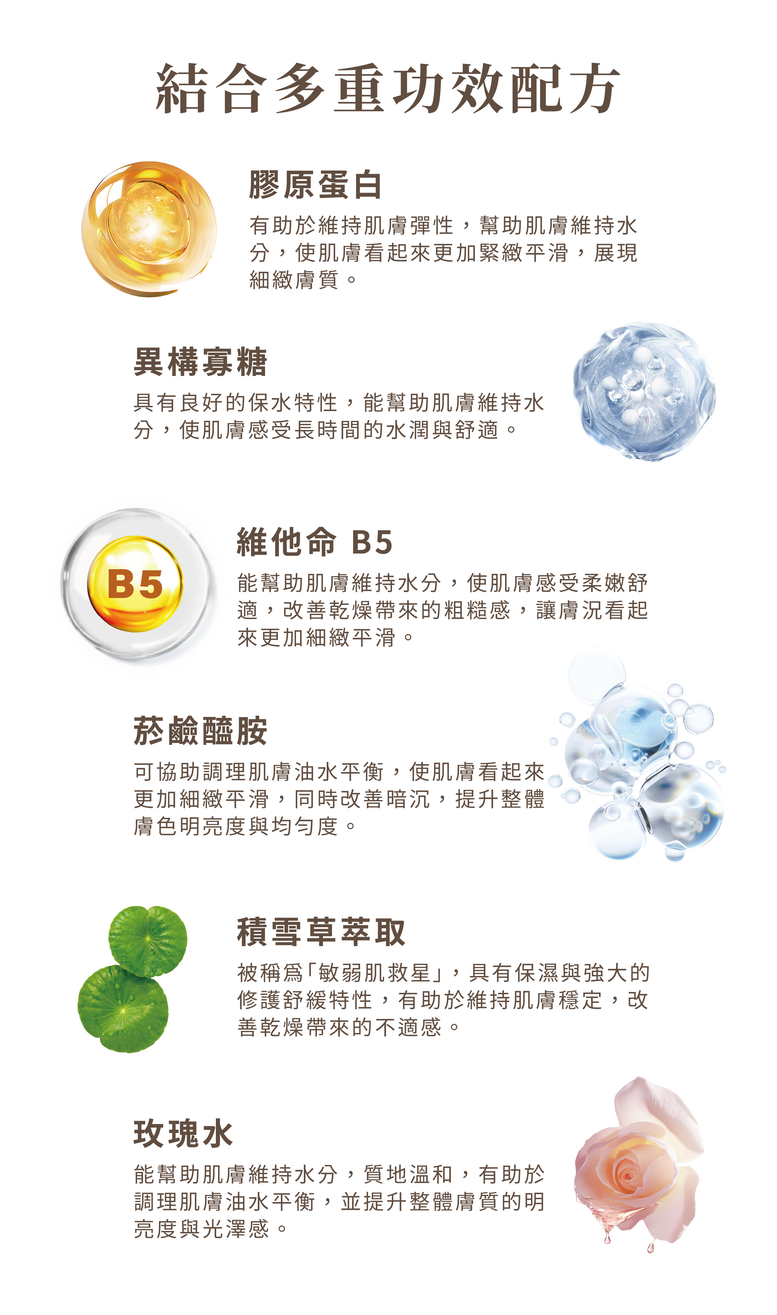 膠原蛋白、異構寡糖、戈氏副擬桿菌外囊泡、維他命原B5、菸鹼醯胺、積雪草萃取、玫瑰水。