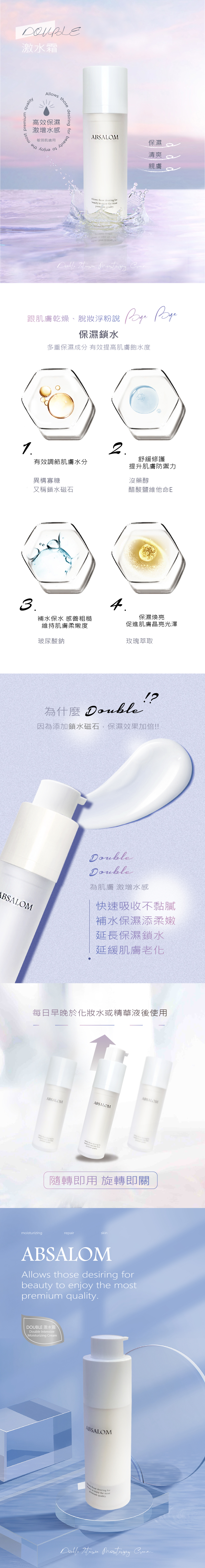 保濕激增水感,讓面部形成保護膜鎖緊肌膚水分,提升儲水功能,緊緻肌膚、撫平細紋。