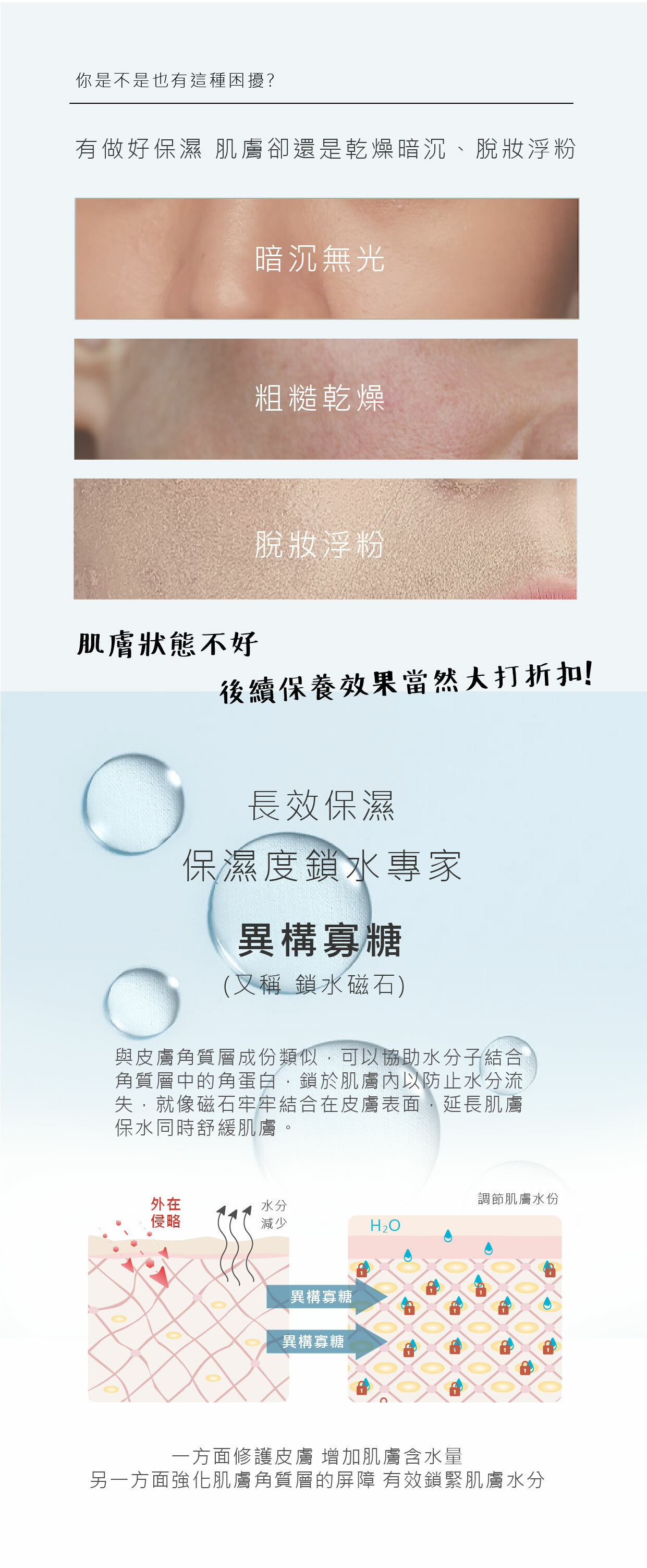 異構寡糖(鎖水磁石)、神經醯胺、酪梨油、白茅提取物、澳洲胡桃籽油、甘草酸鉀