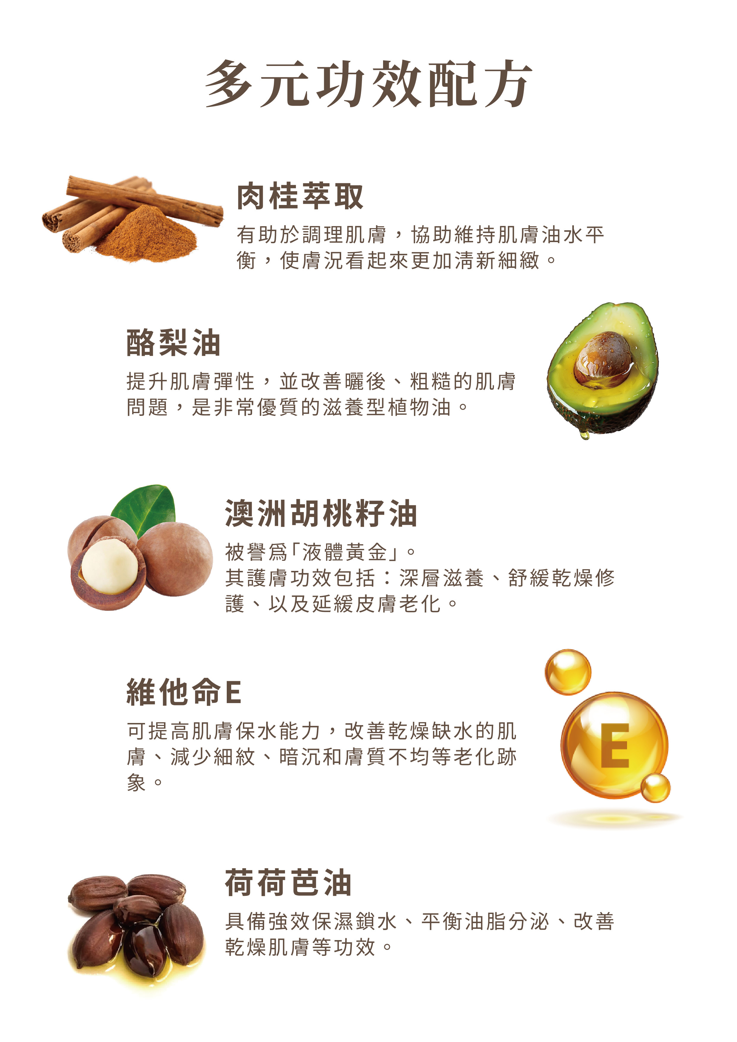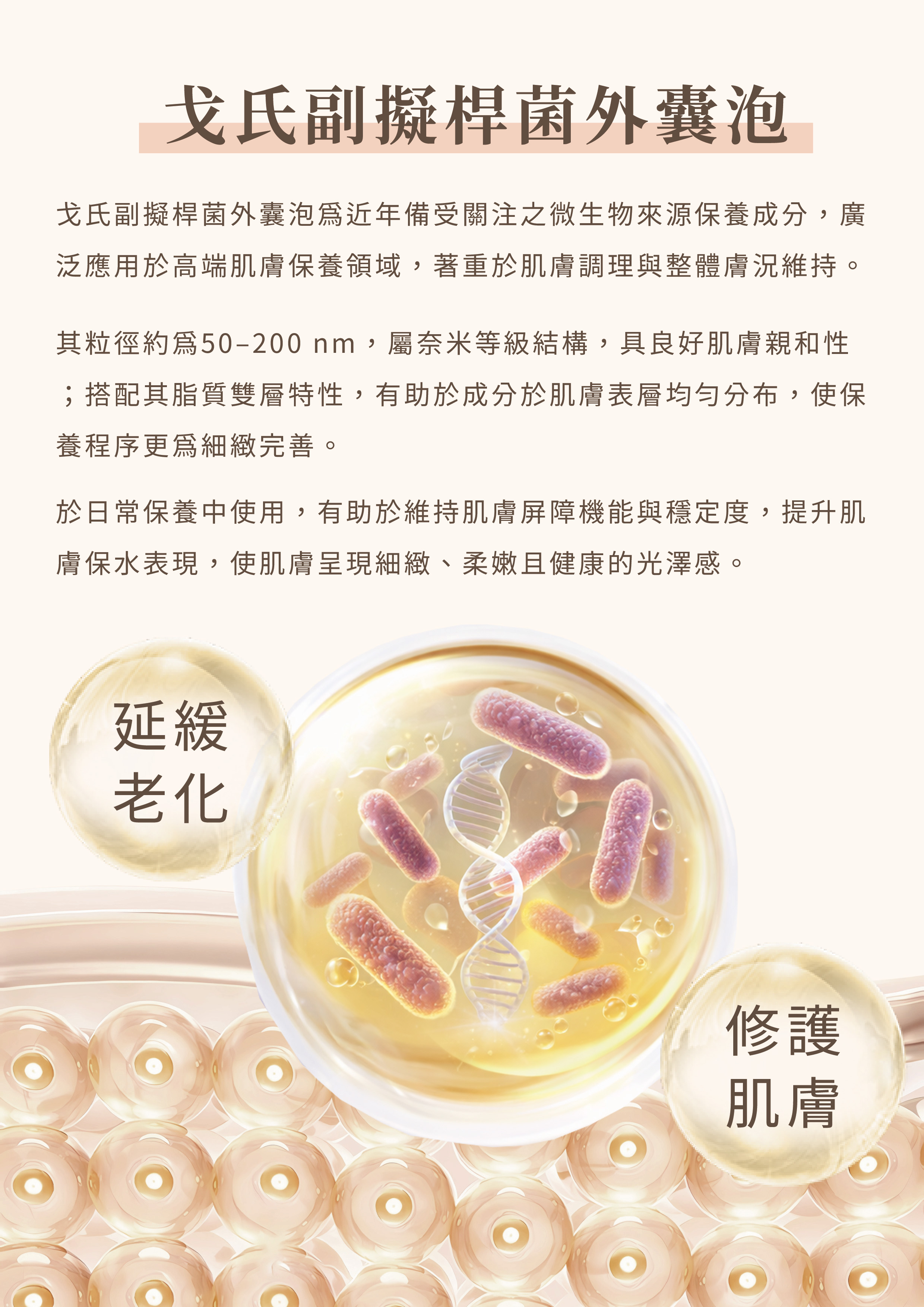 戈氏副擬桿菌外囊泡、牛奶外泌體、肉桂萃取、酪梨油、澳洲胡桃籽油、維他命E、荷荷芭油。
