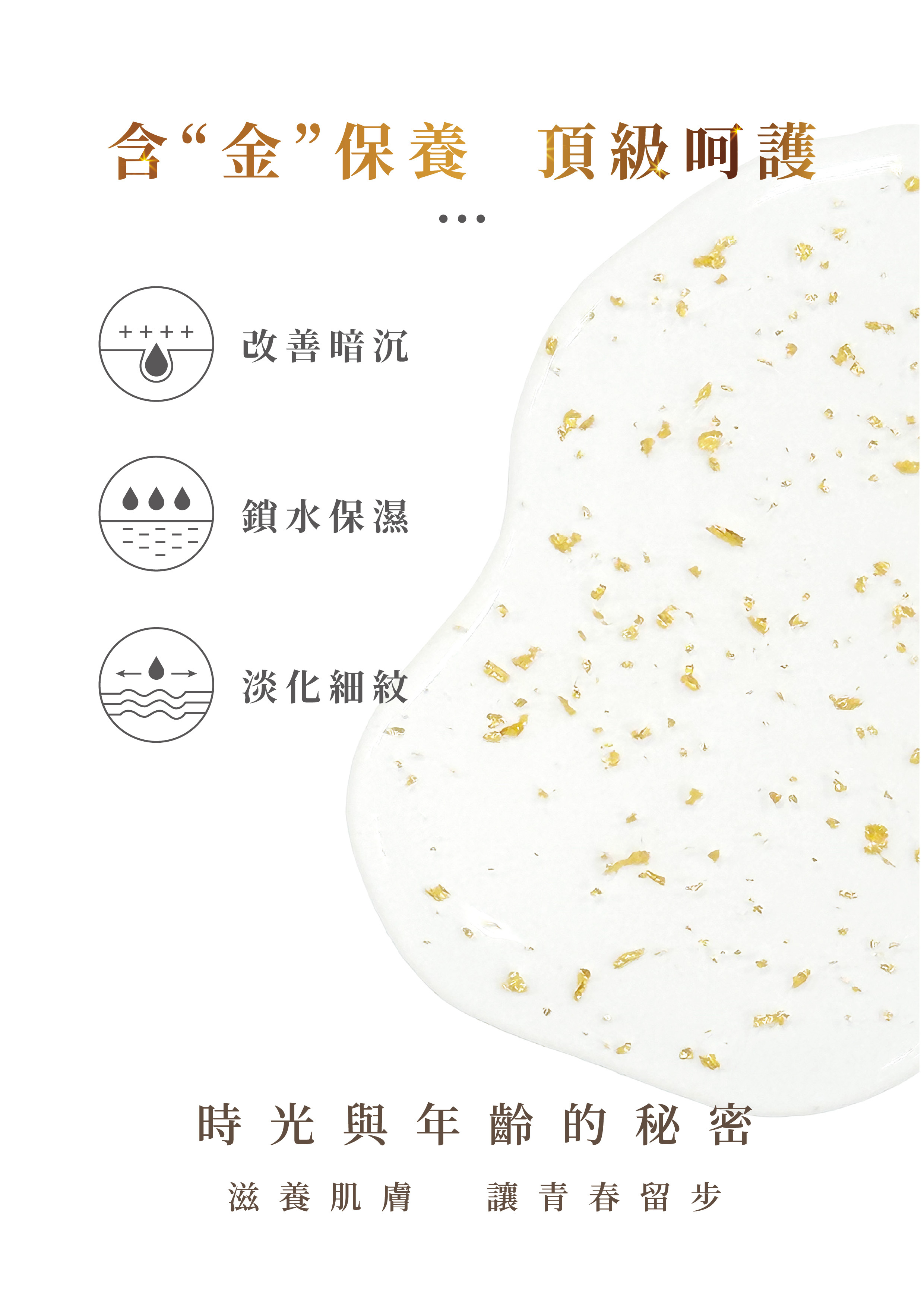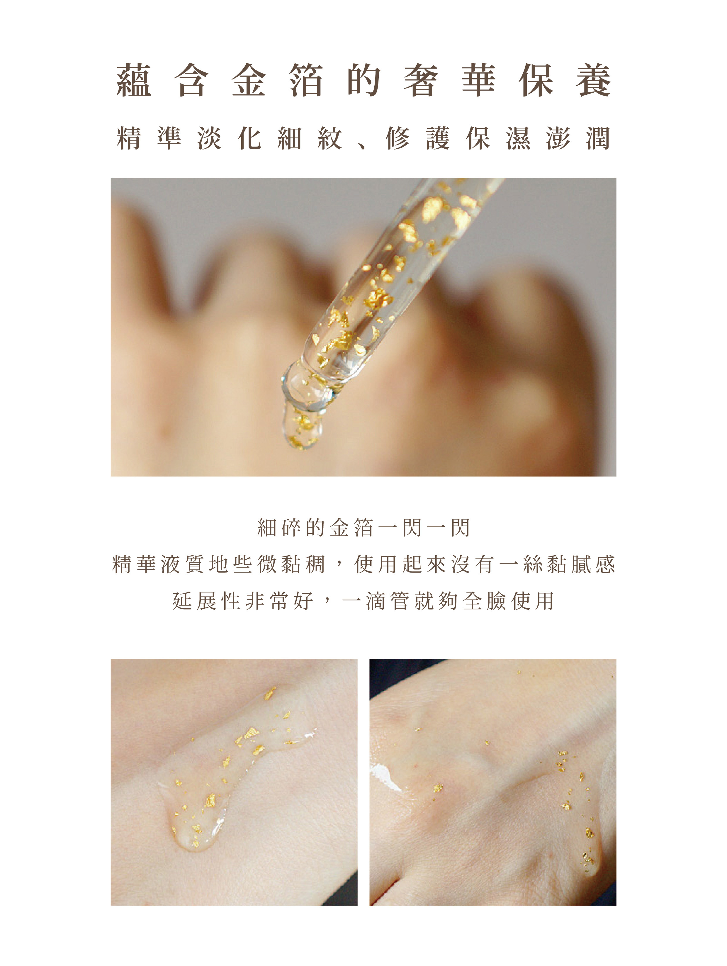 蘊含金箔的奢華保養,能夠淡化細紋,提供豐富的營養和水分,讓肌膚更加光滑、柔軟和有彈性。