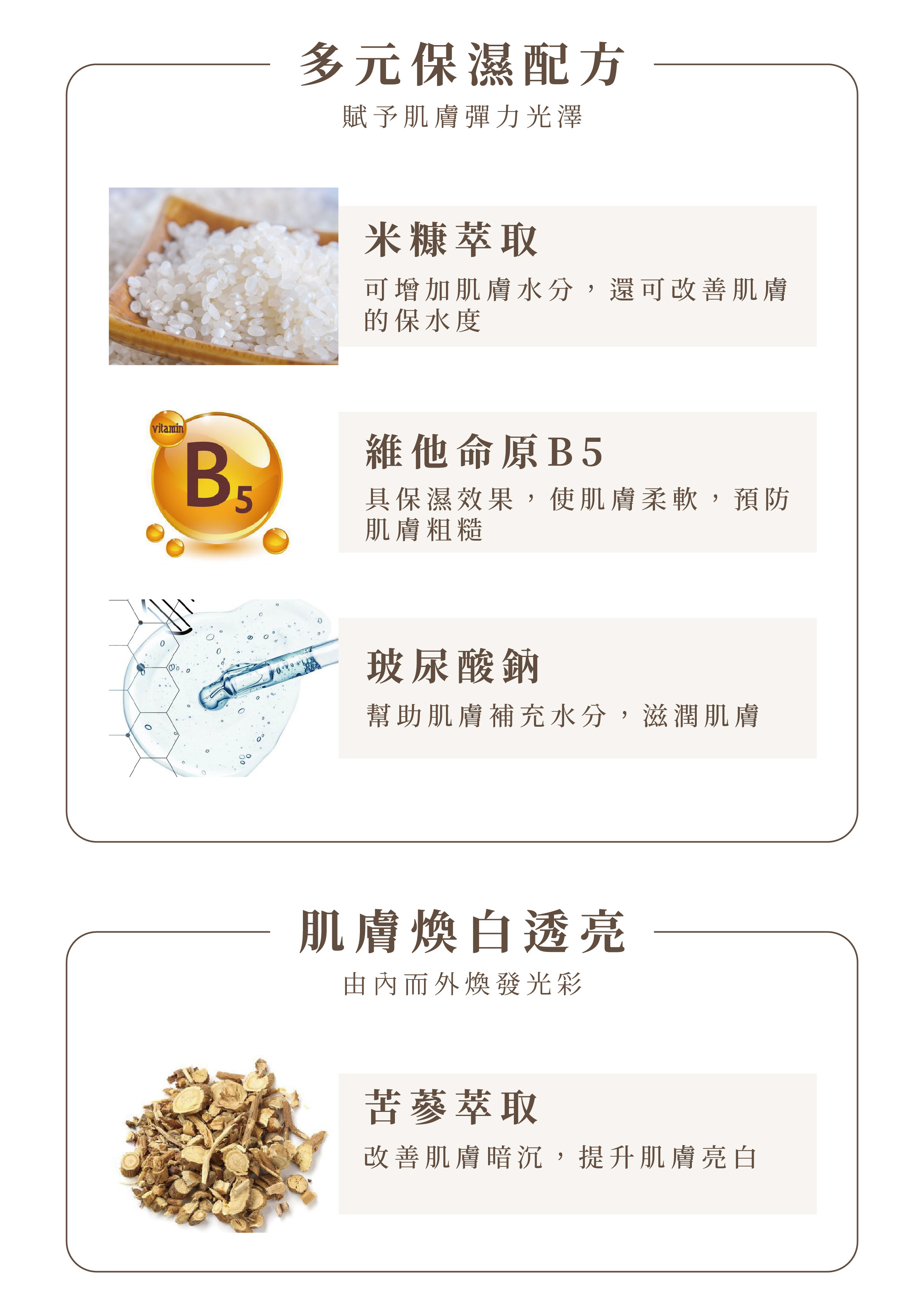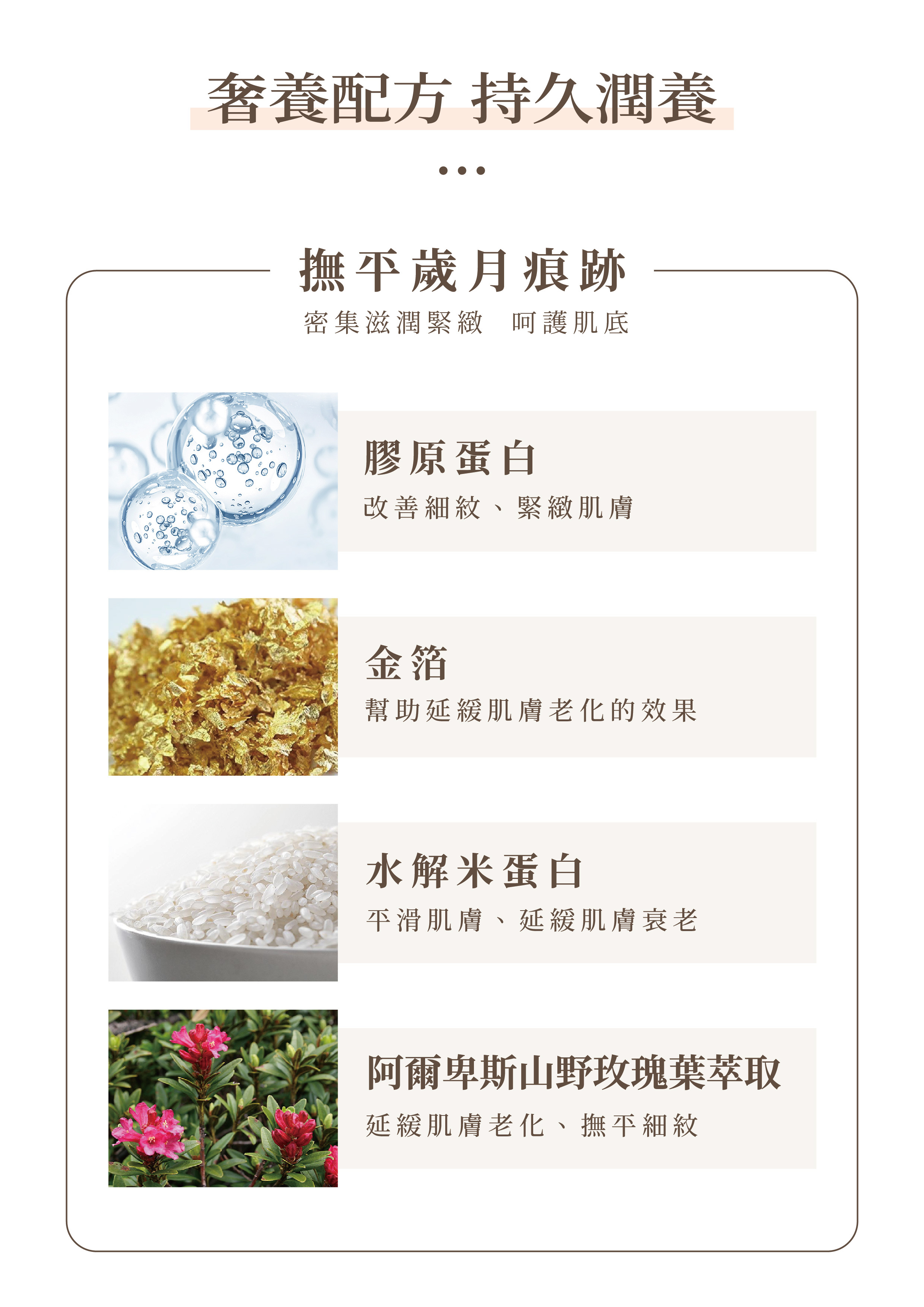 膠原蛋白、金箔、米糠萃取、水解米蛋白、苦蔘萃取、阿爾卑斯山野玫瑰葉萃取、維他命原B5、玻尿酸鈉。
