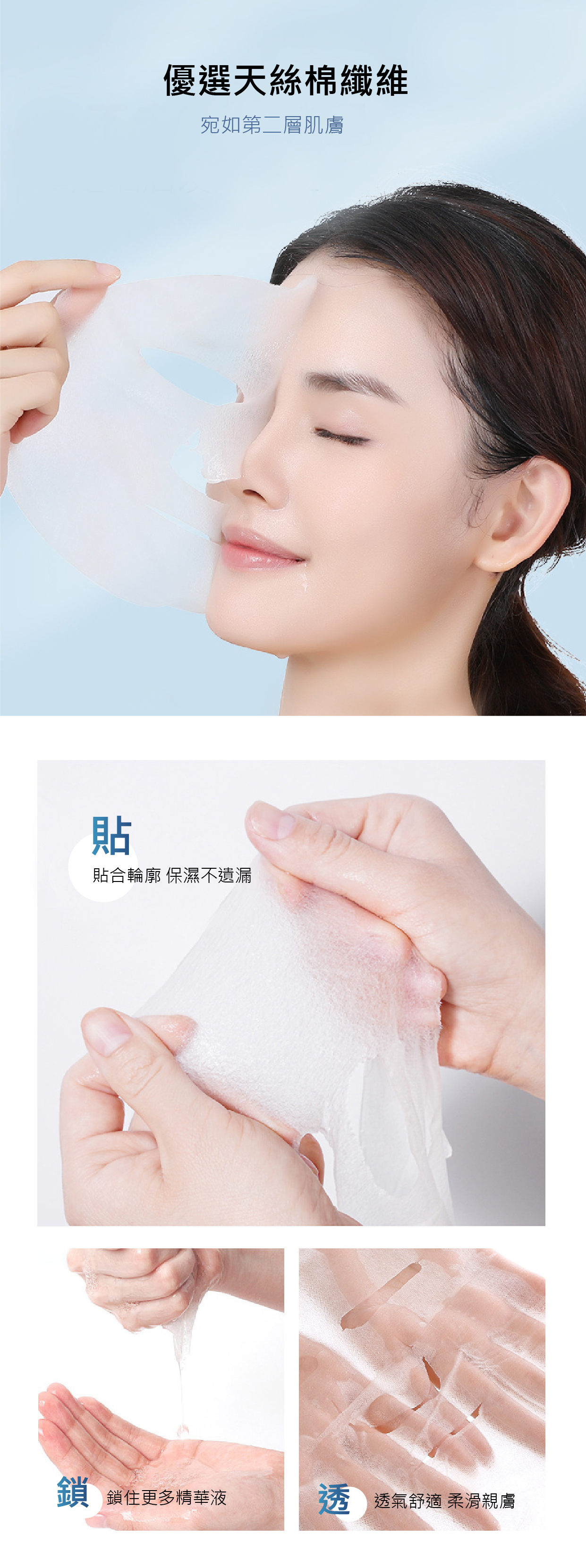 4. 完全服貼於臉部曲線,似一張隱形面膜,同時保留肌膚吸收及呼吸空間,達到最佳保養效果。