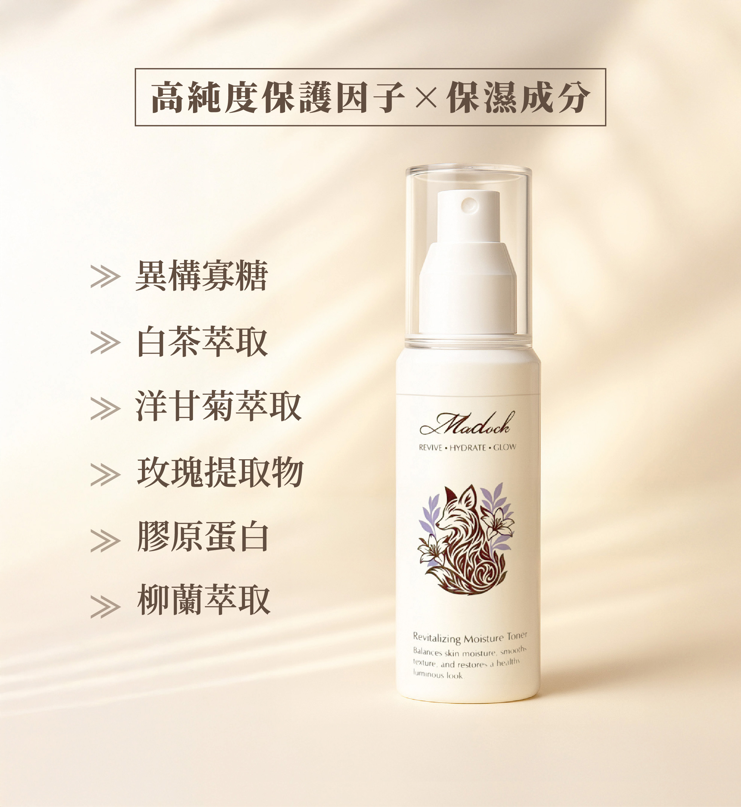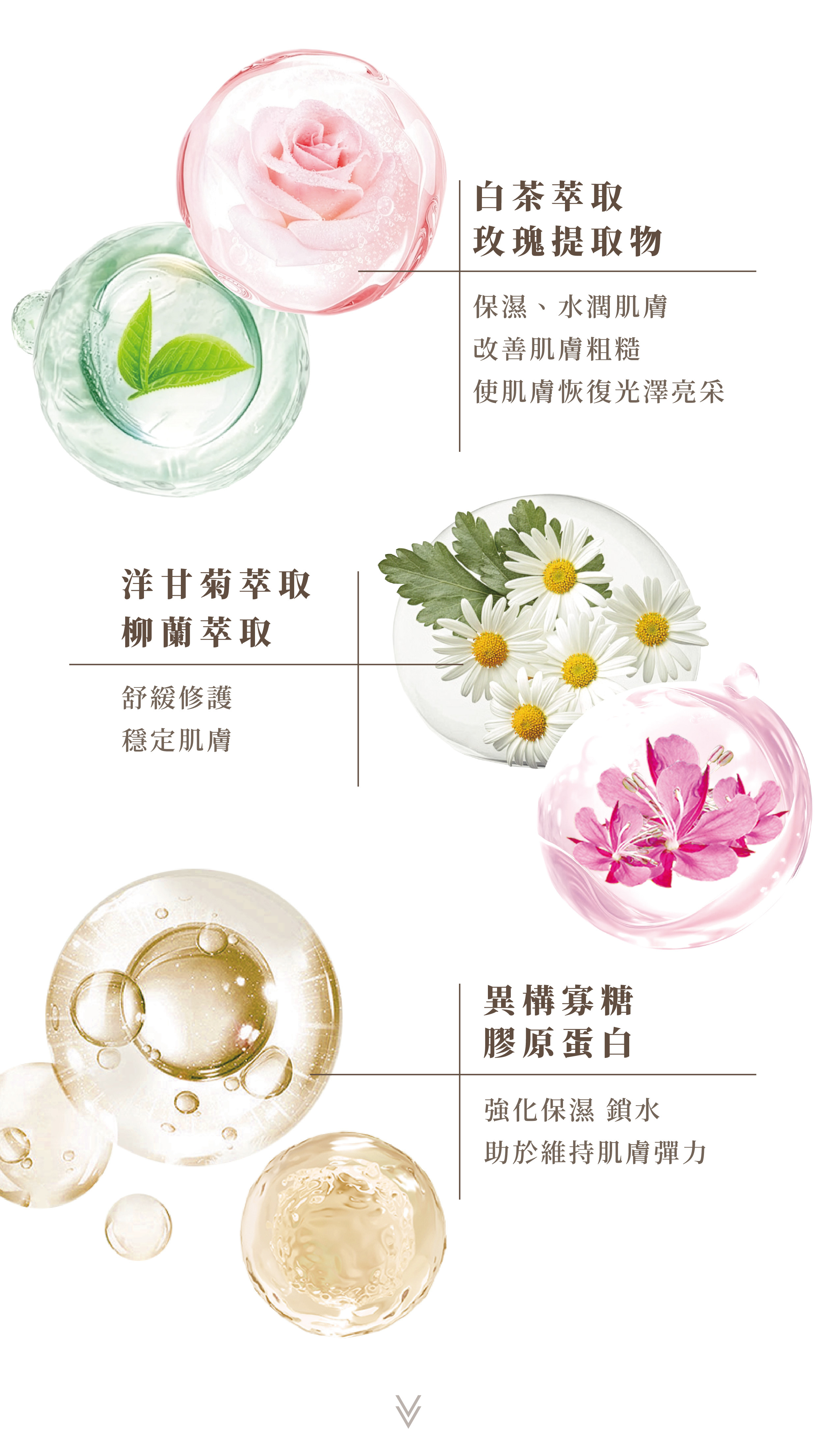 異構寡糖、洋甘菊萃取、膠原蛋白、白茶萃取、柳蘭萃取、玫瑰提取物。