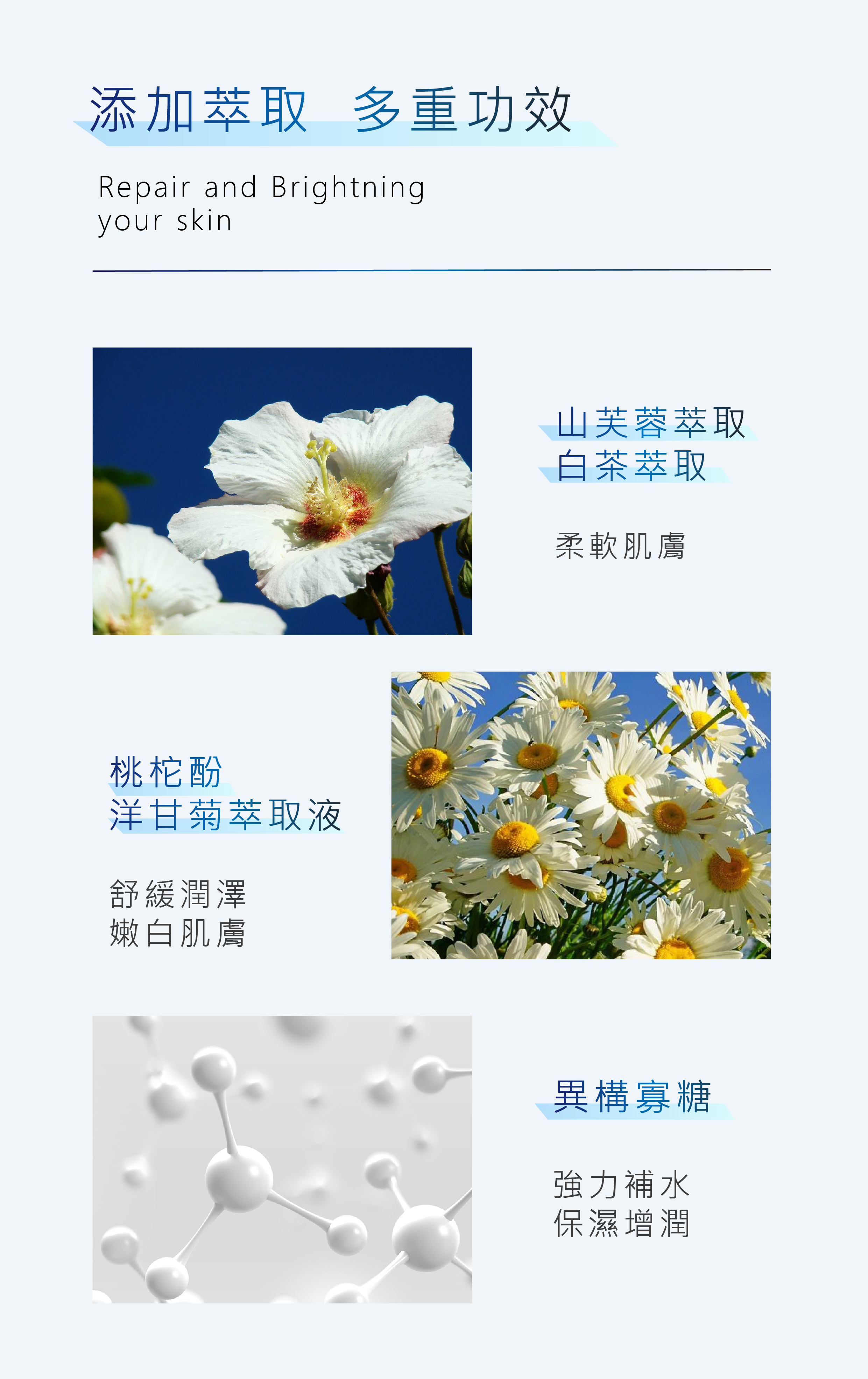 山芙蓉萃取、異構寡糖、白茶萃取、洋甘菊萃取、桃柁酚。