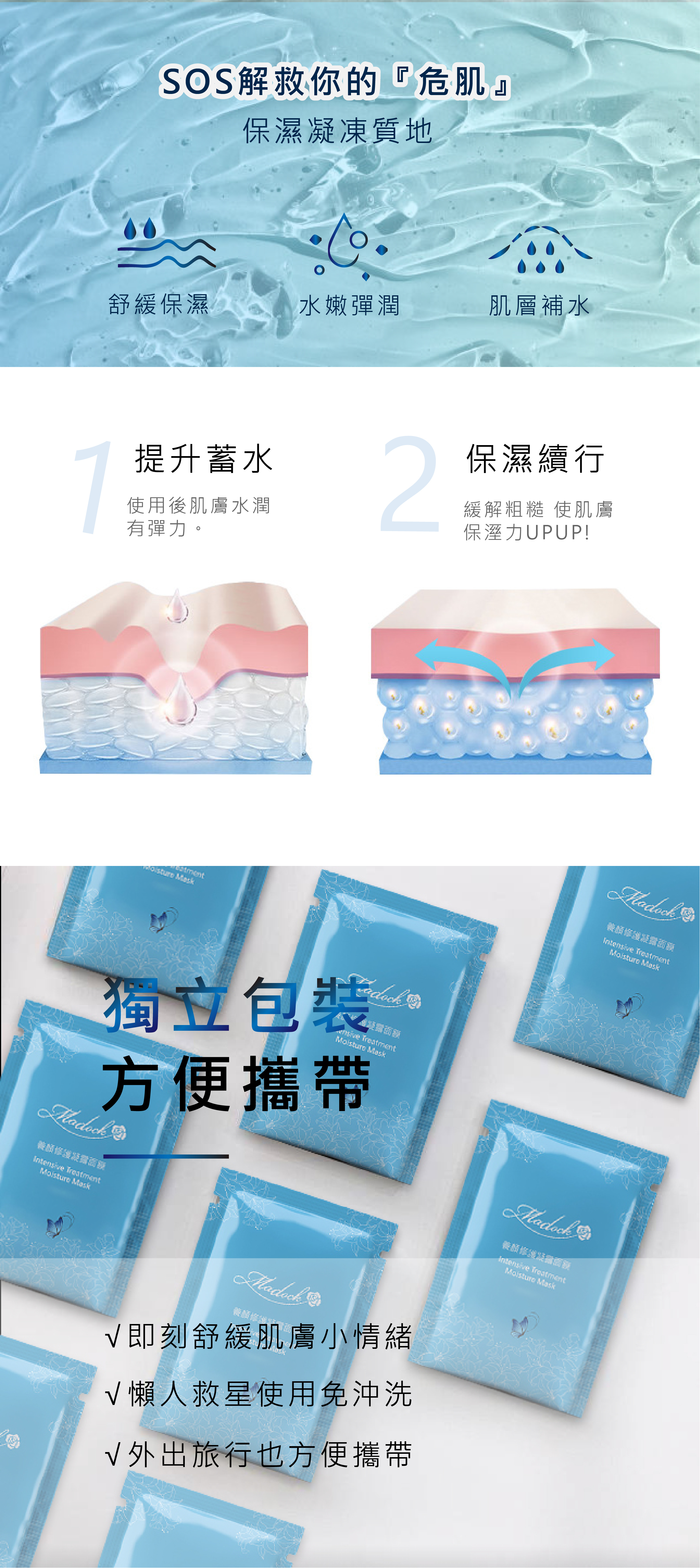 強化補水、保濕、緊緻鎖水、儲水平衡。