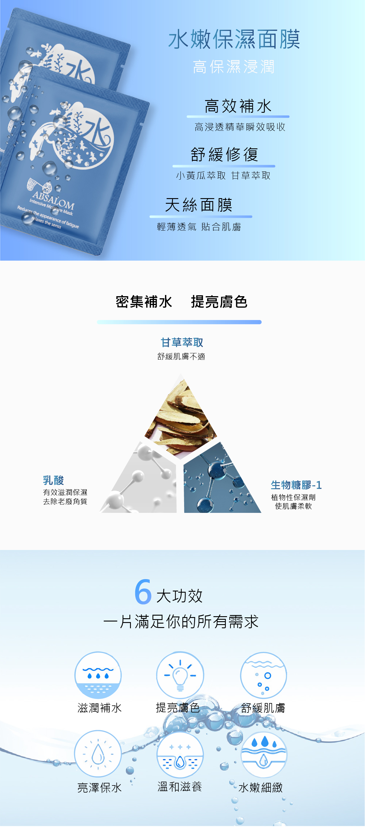 修護補水、緊緻鎖水、儲水平衡、維持肌膚水嫩細緻。