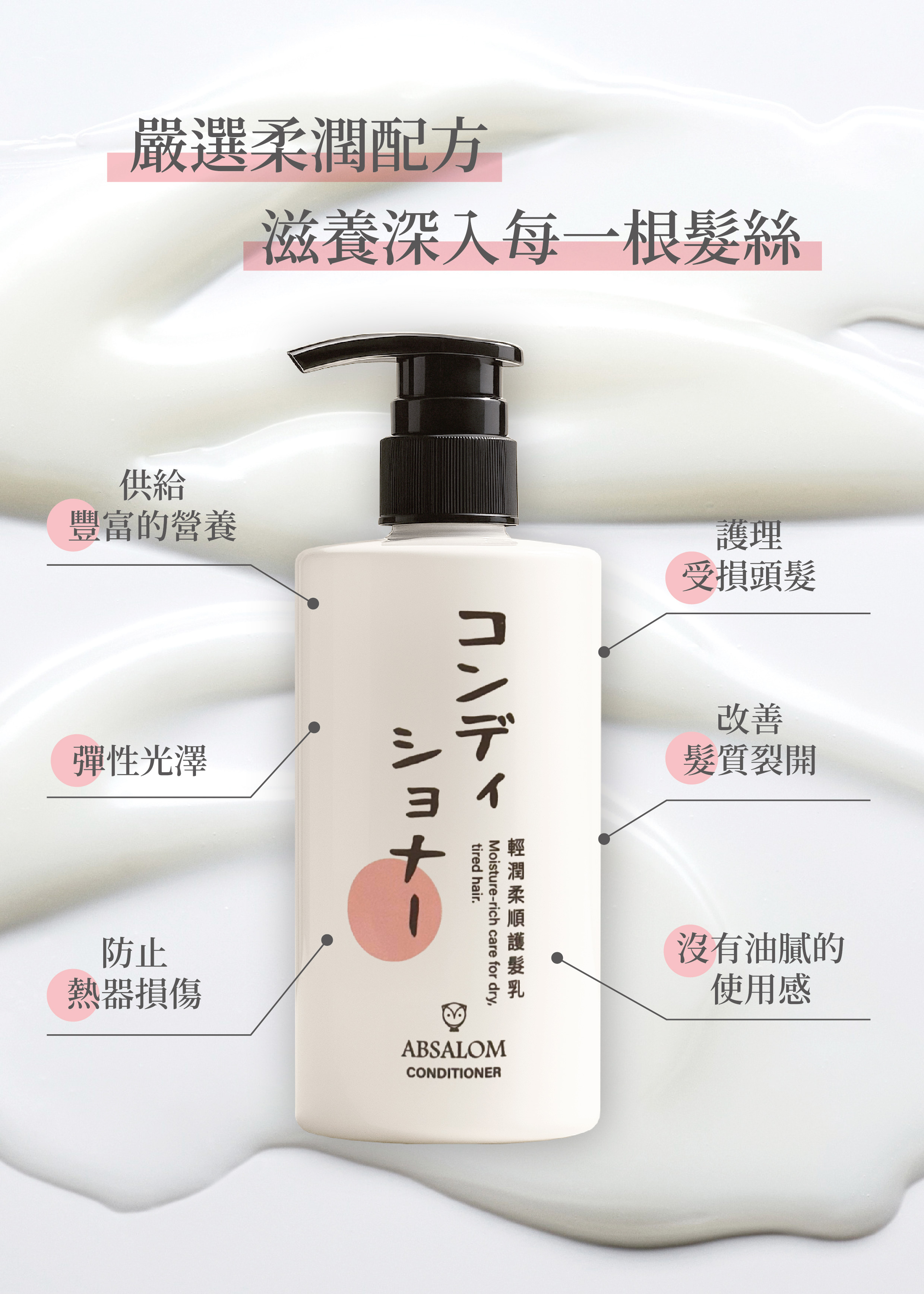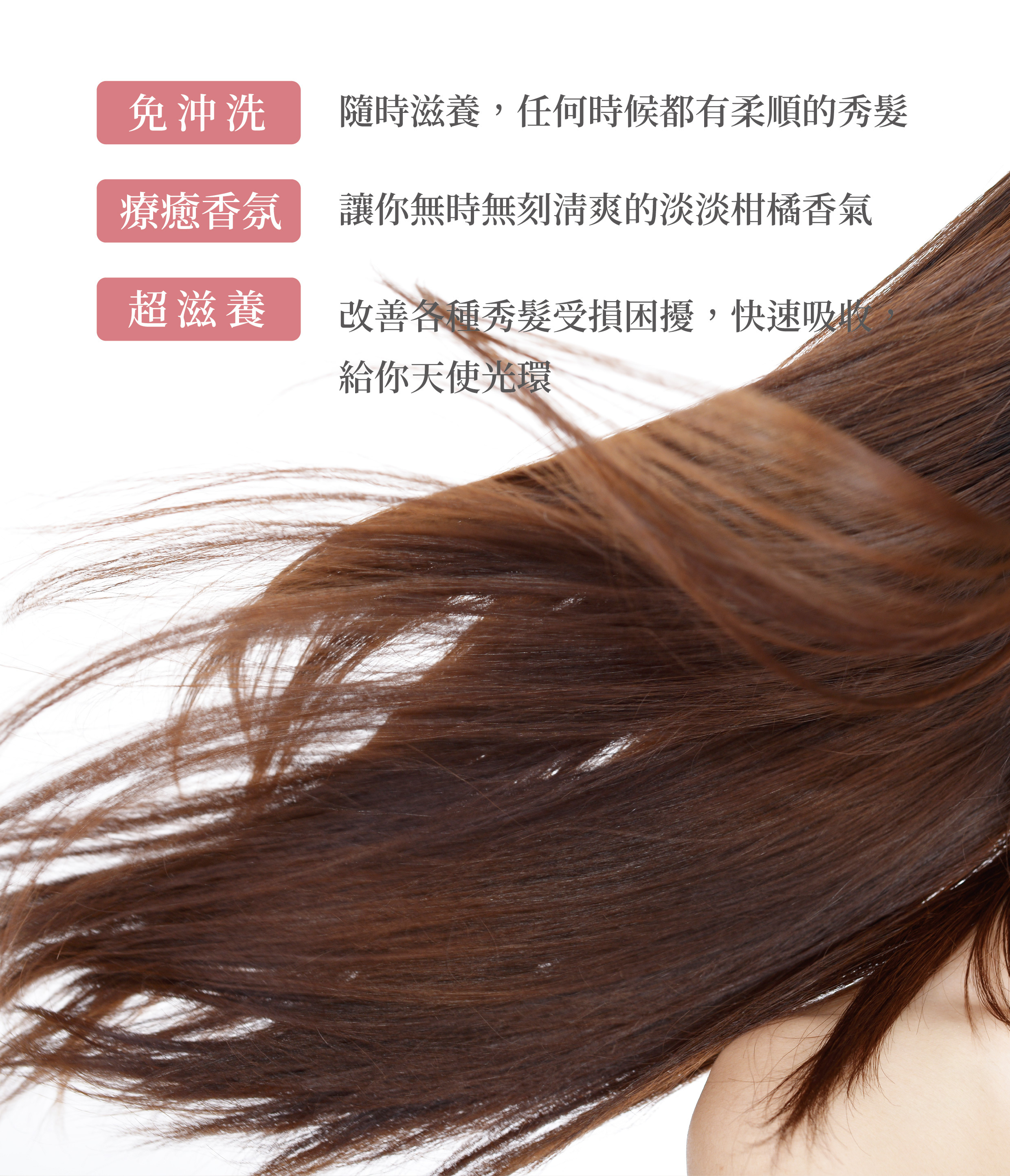 「免沖洗型」護髮精華,均勻塗抹於髮中到髮尾,滋潤同時保持柔順光澤。