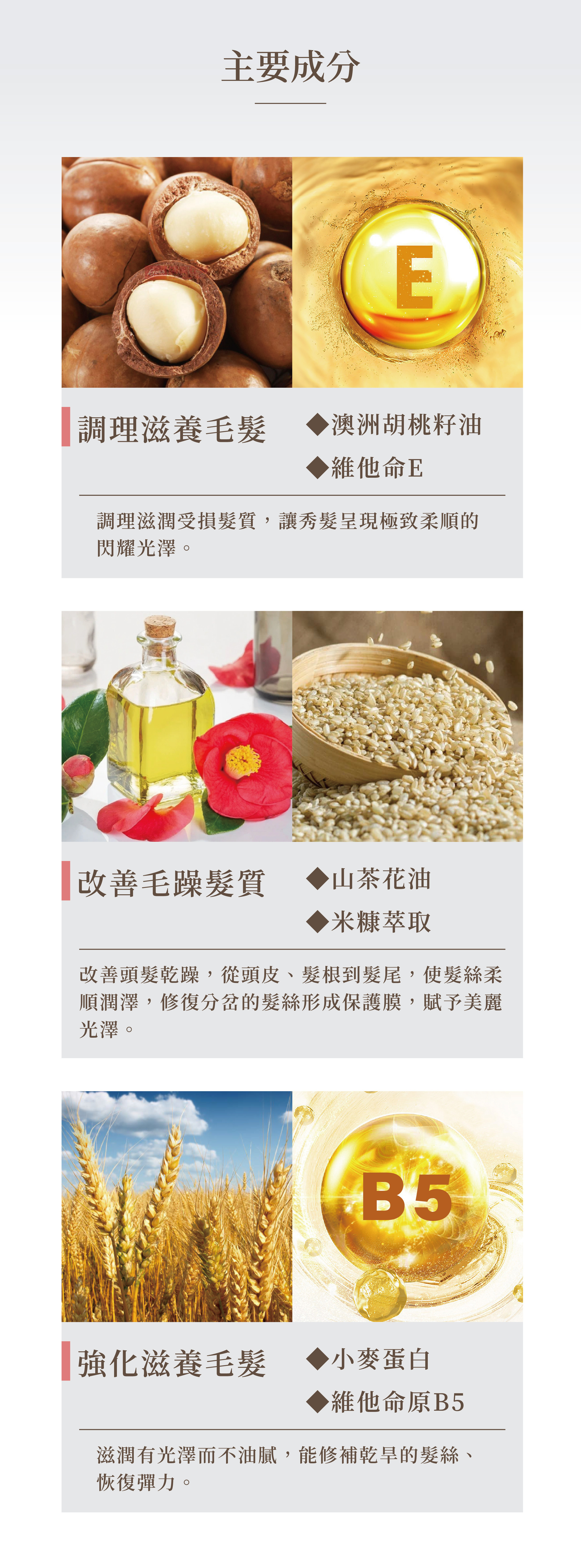 澳洲胡桃籽油、維他命E、山茶花油、水解小麥蛋白、米糠萃取、維他命原B5。