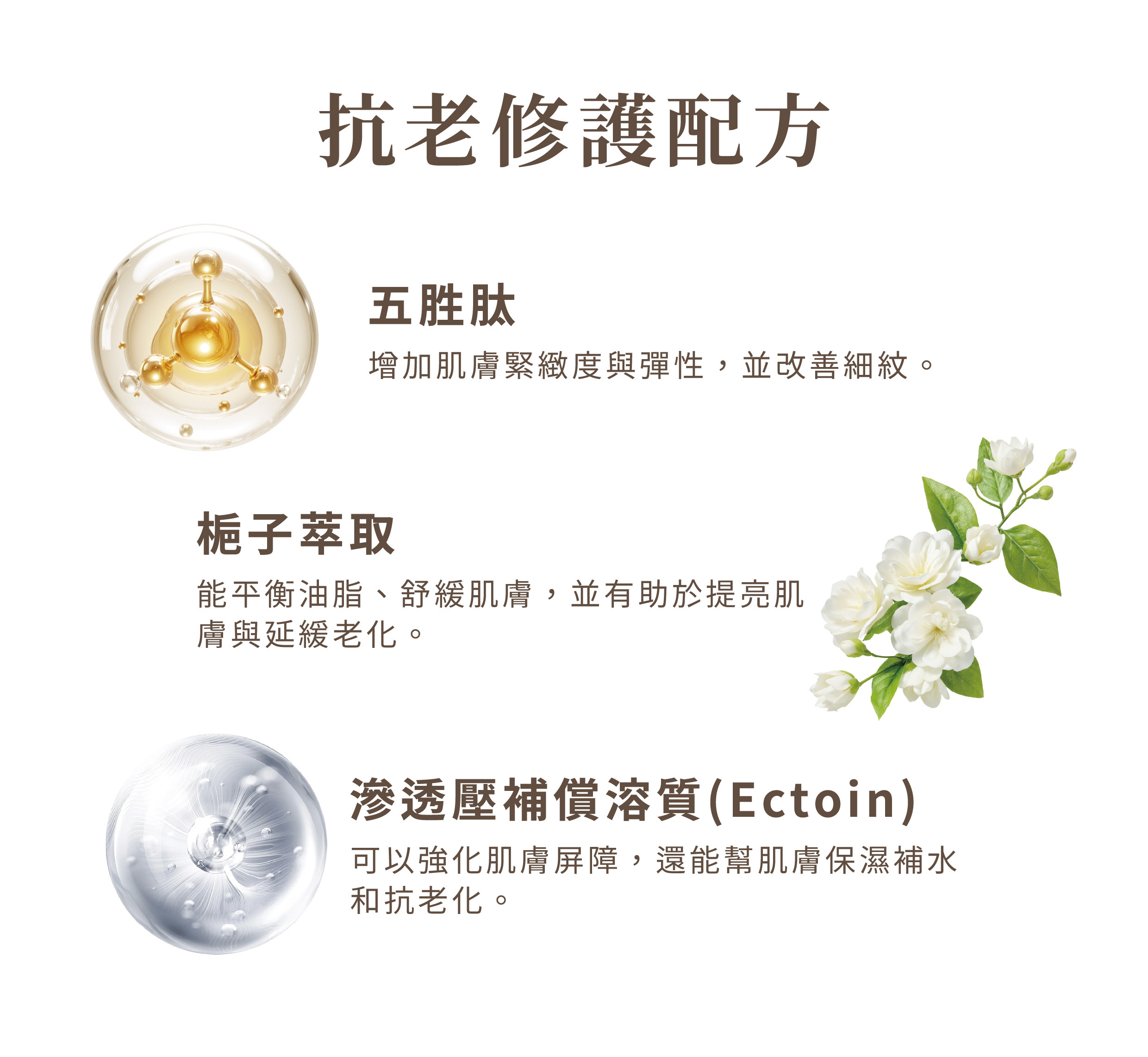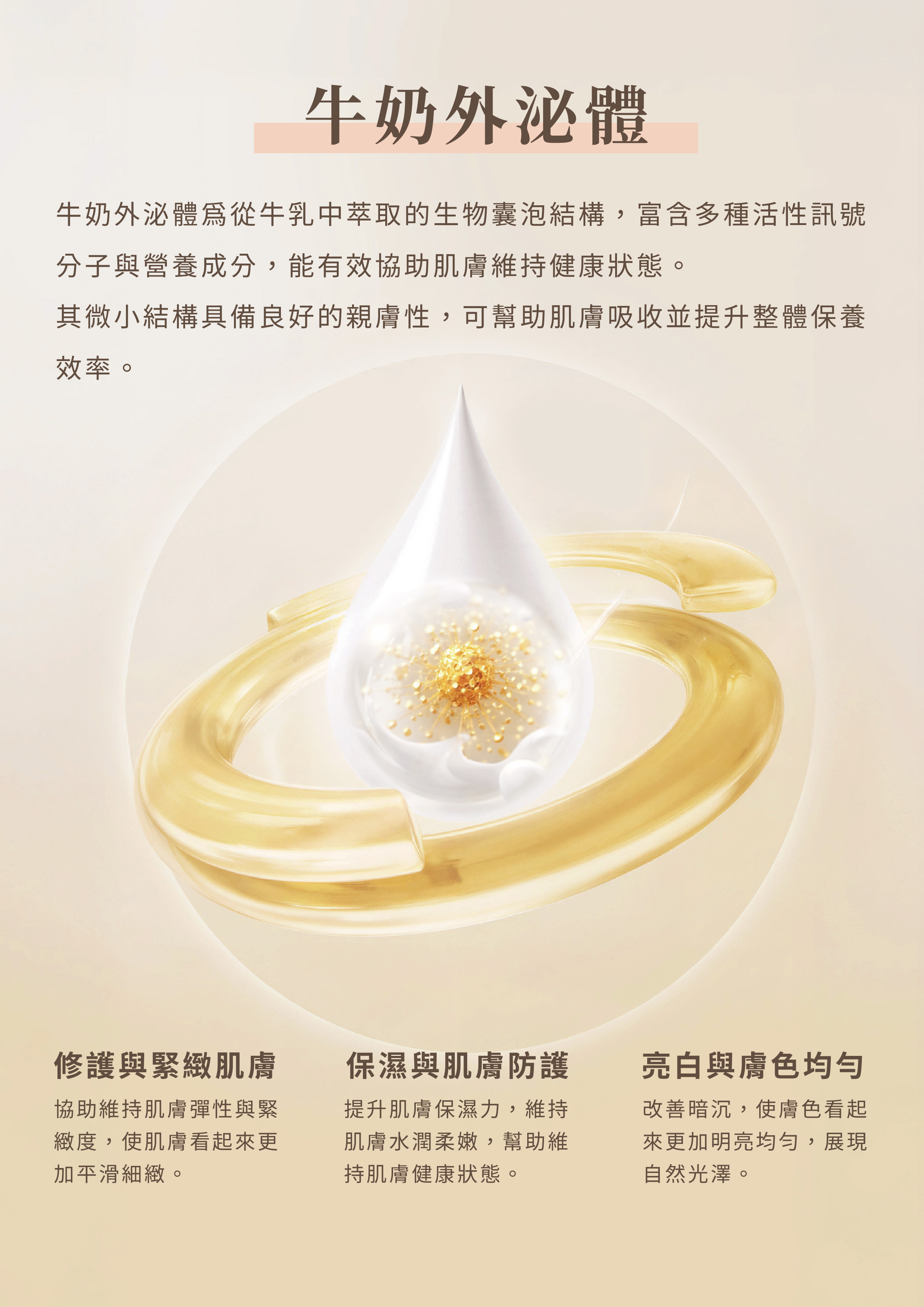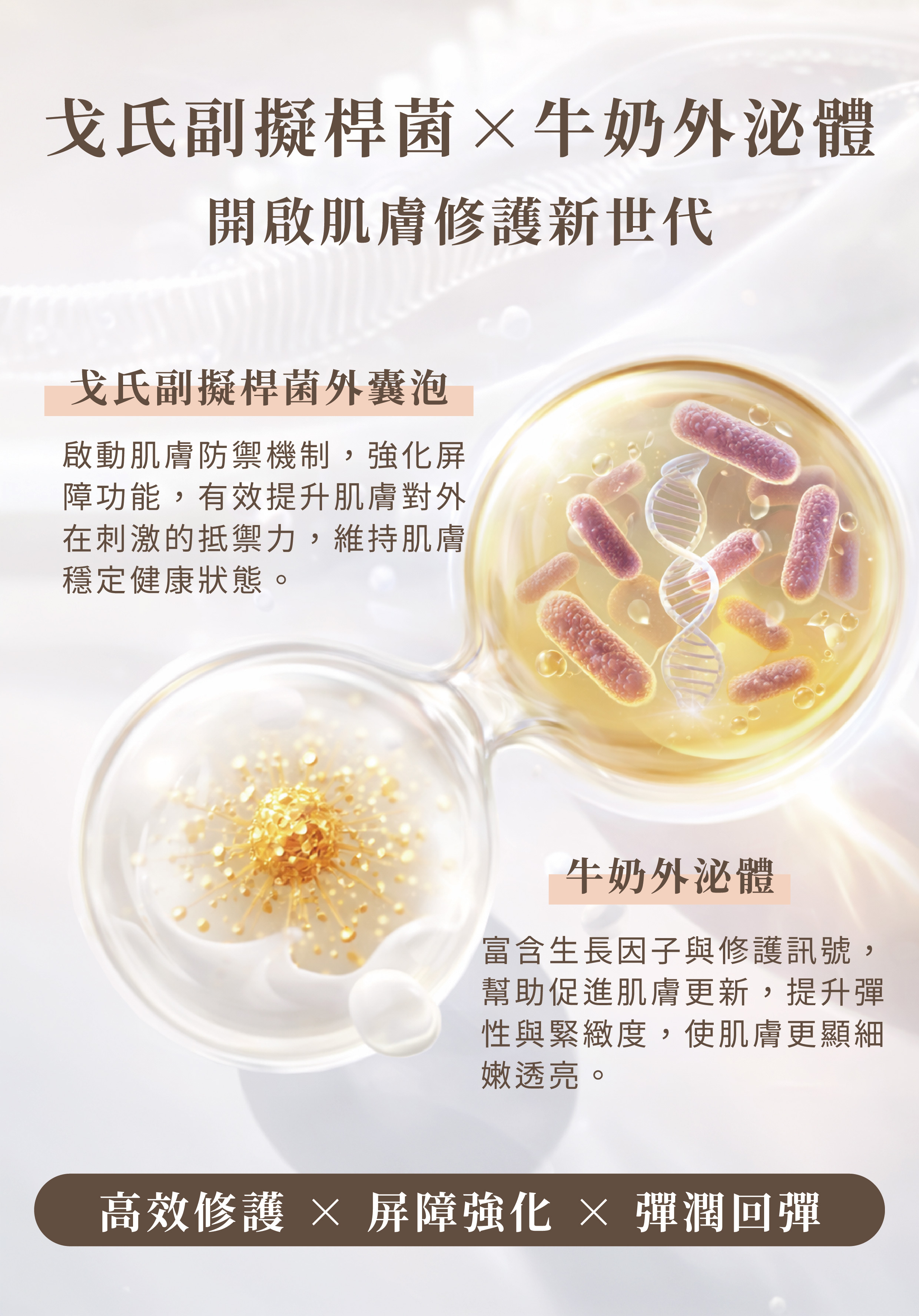 戈氏副擬桿菌外囊泡、牛奶外泌體、梔子萃取、滲透壓補償溶質、五胜肽、山雞椒精油、乳香精油、薰衣草精油、檀香精油。