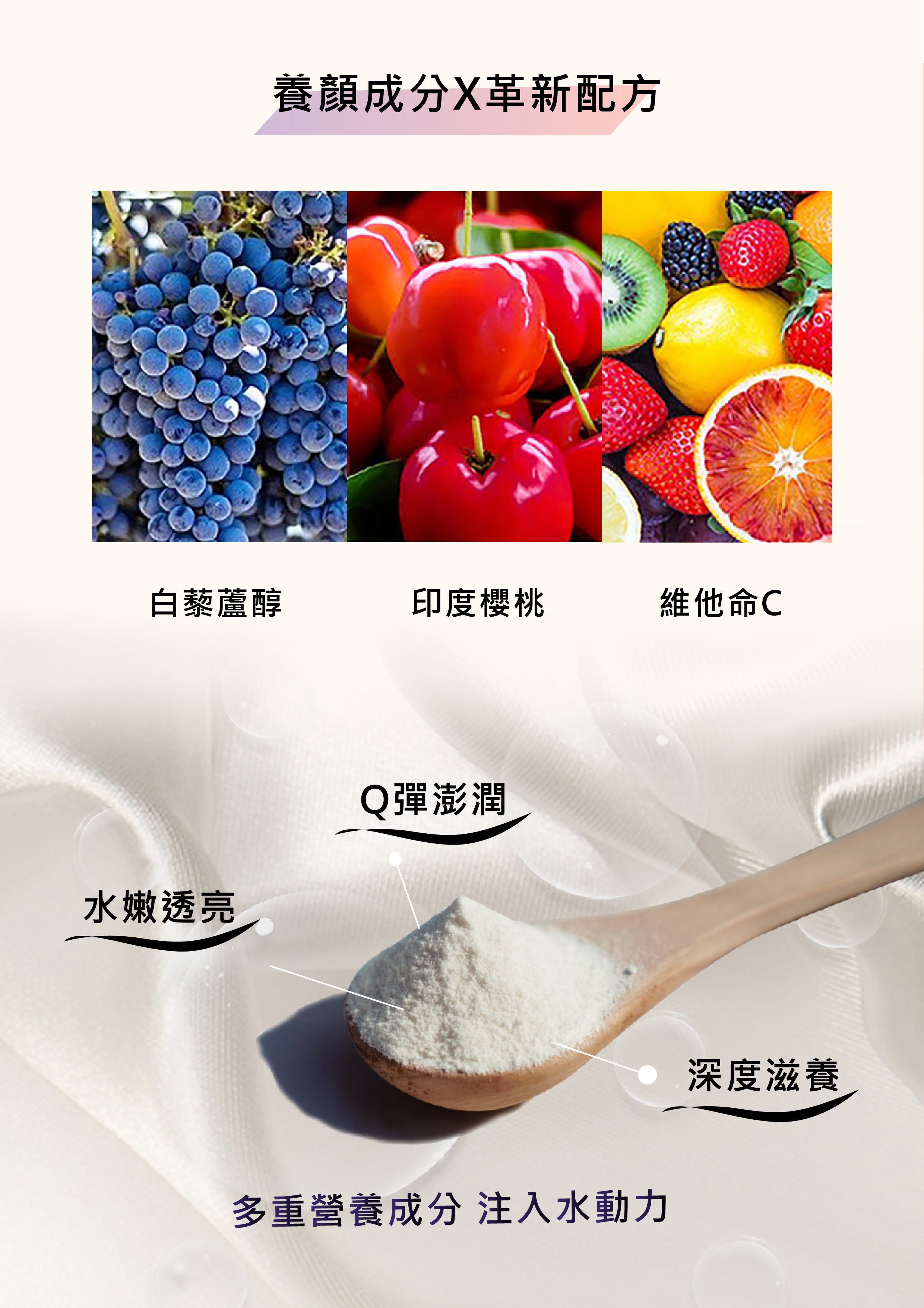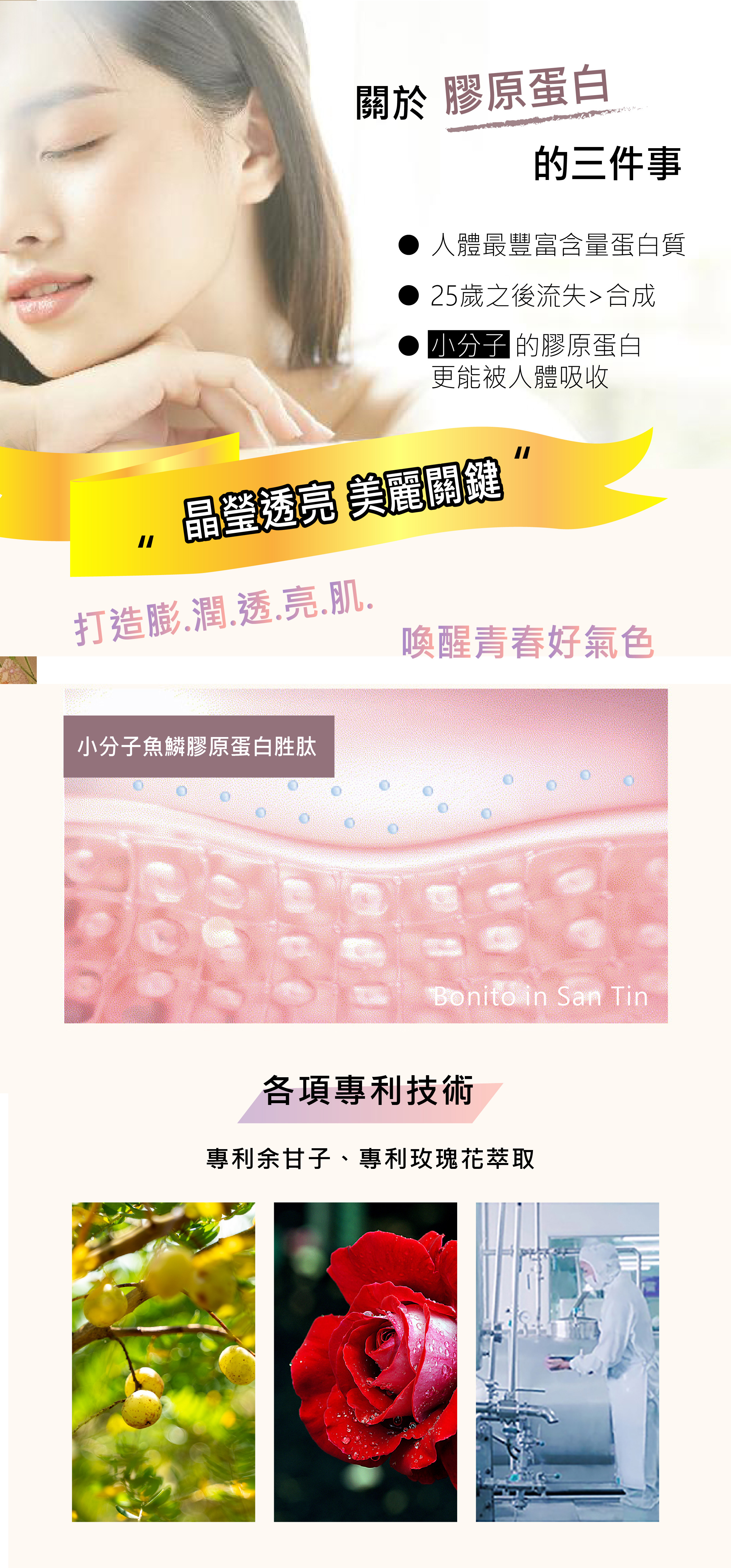 專利余甘子、專利玫瑰花瓣萃取、二型膠原蛋白、小分子魚鱗膠原蛋白胜肽。