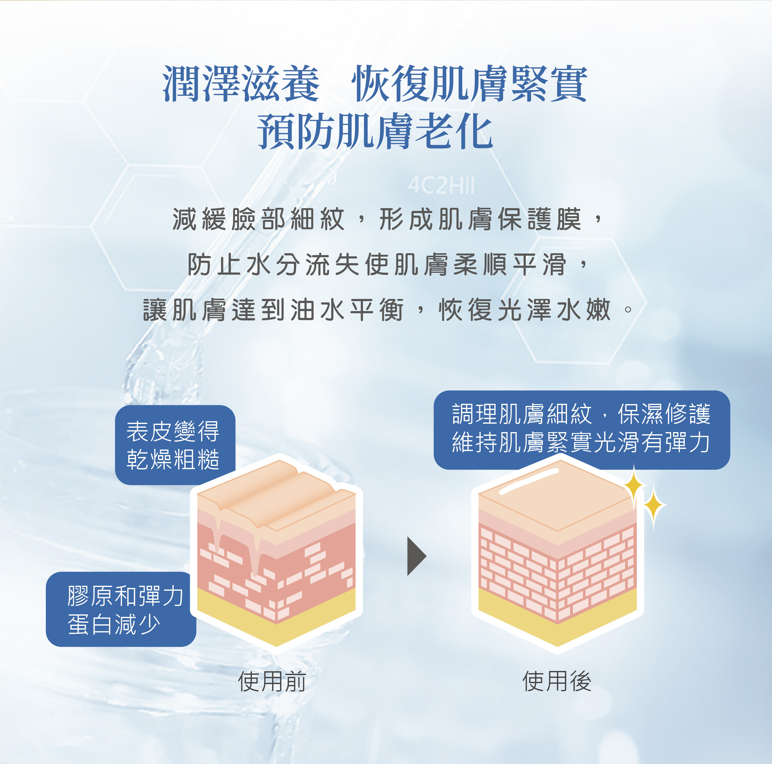 淡化細紋、緊實彈潤、明亮光澤、形成肌膚保護膜。