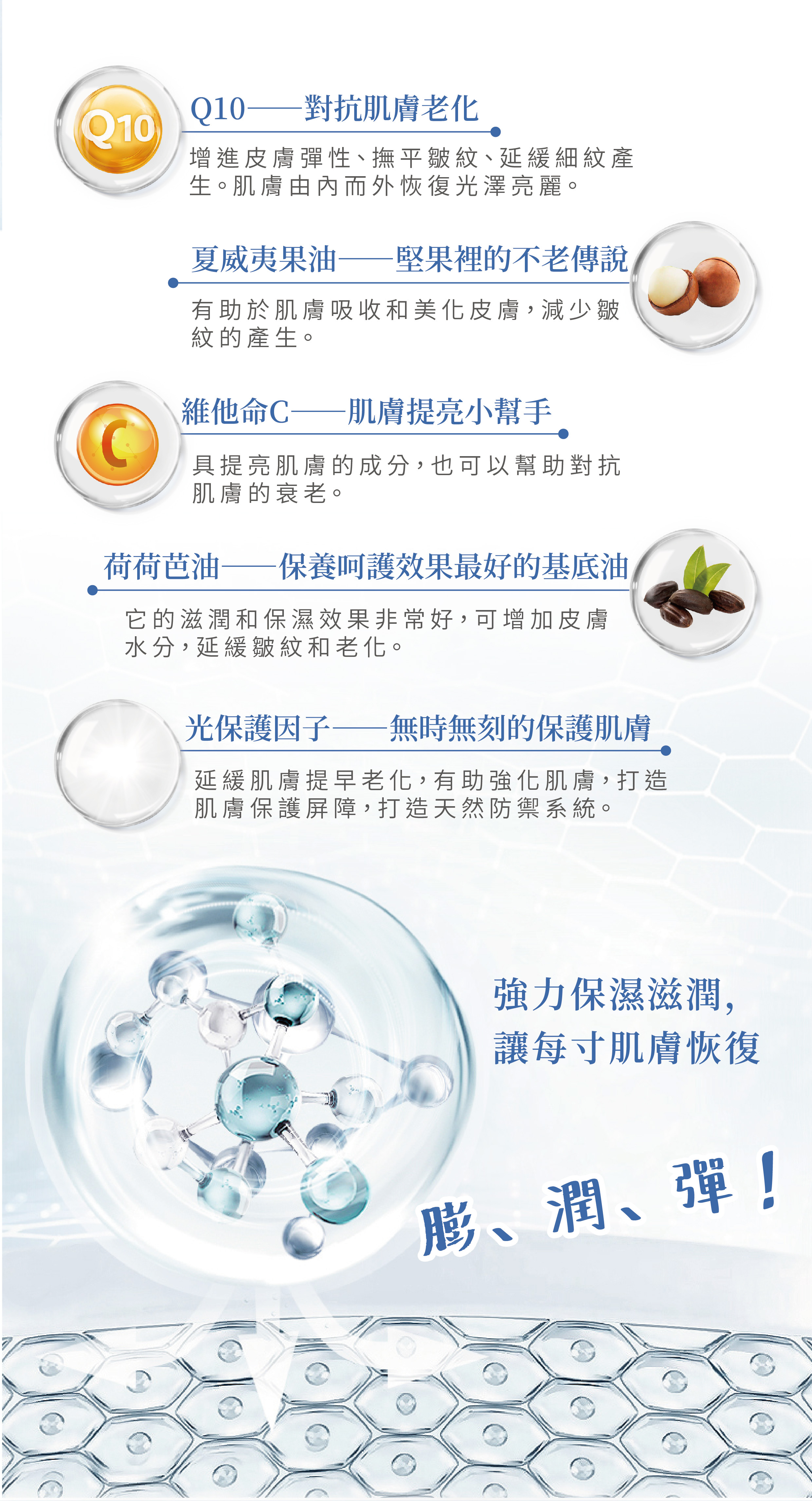 夏威夷果油、荷荷巴油、光保護因子、Q10。